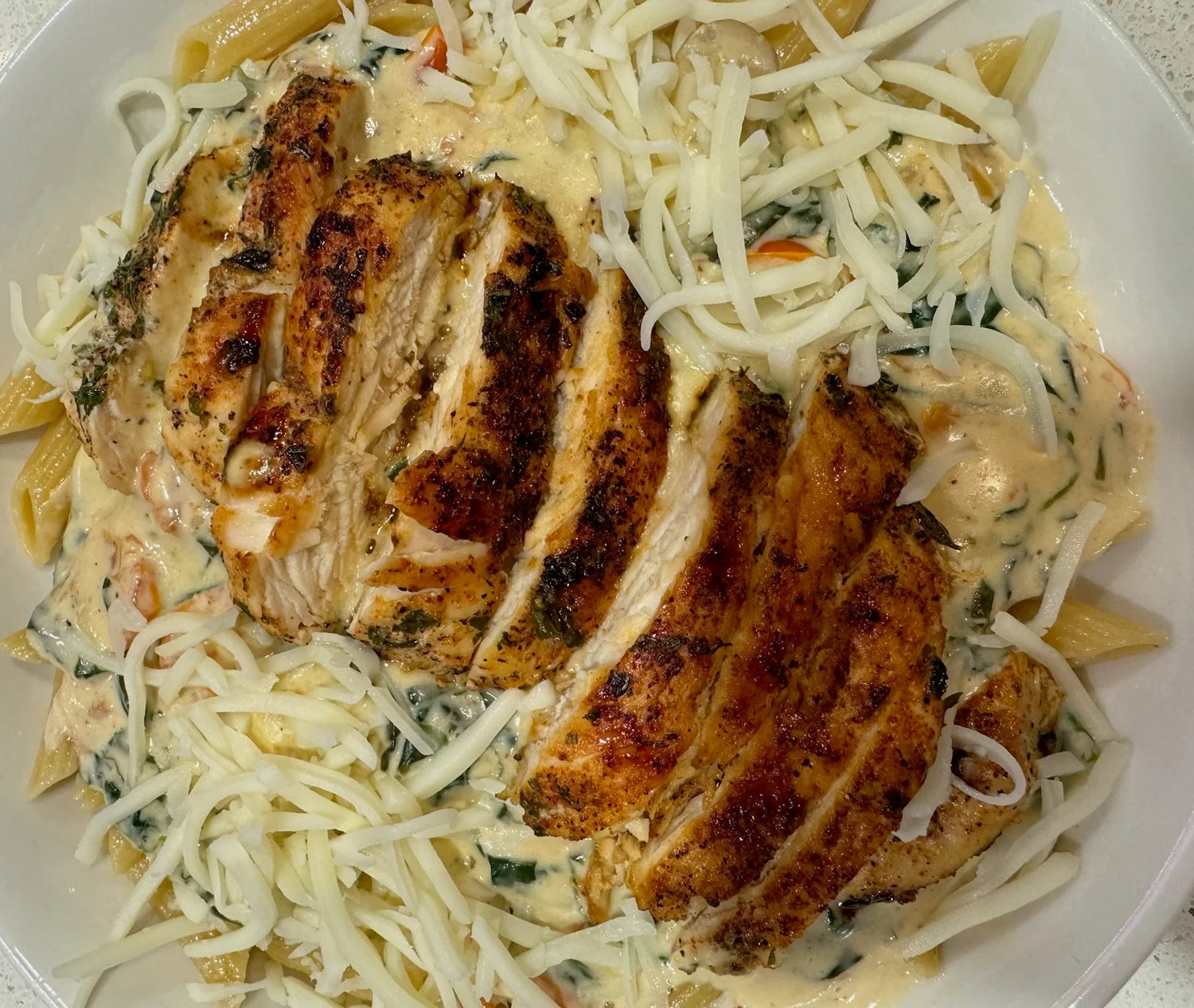 - 2 chicken breasts - 1 pint cherry tomatoes - 1 bag fresh spinach (about 5-6 ounces) - 1 bunch fresh basil - 1/2 package of white mushrooms - 14 ounces penne/fettuccine noodles - 6 cloves garlic, minced - Salt, pepper, garlic powder to taste - Mouton’s All Purpose Seasoning - 2 tablespoons olive oil - 2 tablespoons butter - 2 jars (16 ounces each) garlic Alfredo sauce - 1 cup shredded mozzarella cheese