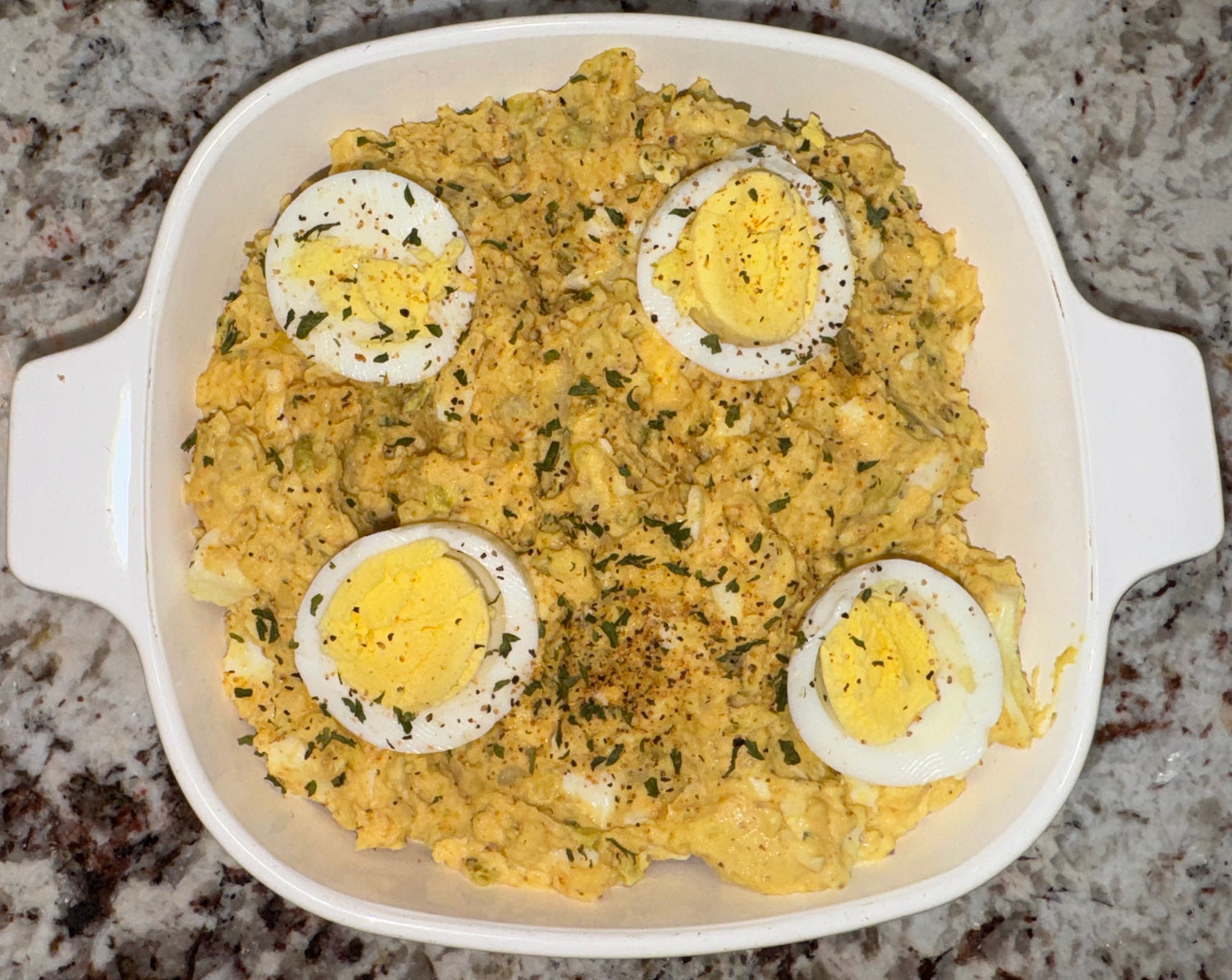 - 4 large potatoes - 6 large eggs - ¾ to 1 cup mayonnaise - ¼ cup mustard - ½ to ¾ cup dill relish - 3 tablespoons Mouton’s All Purpose Seasoning