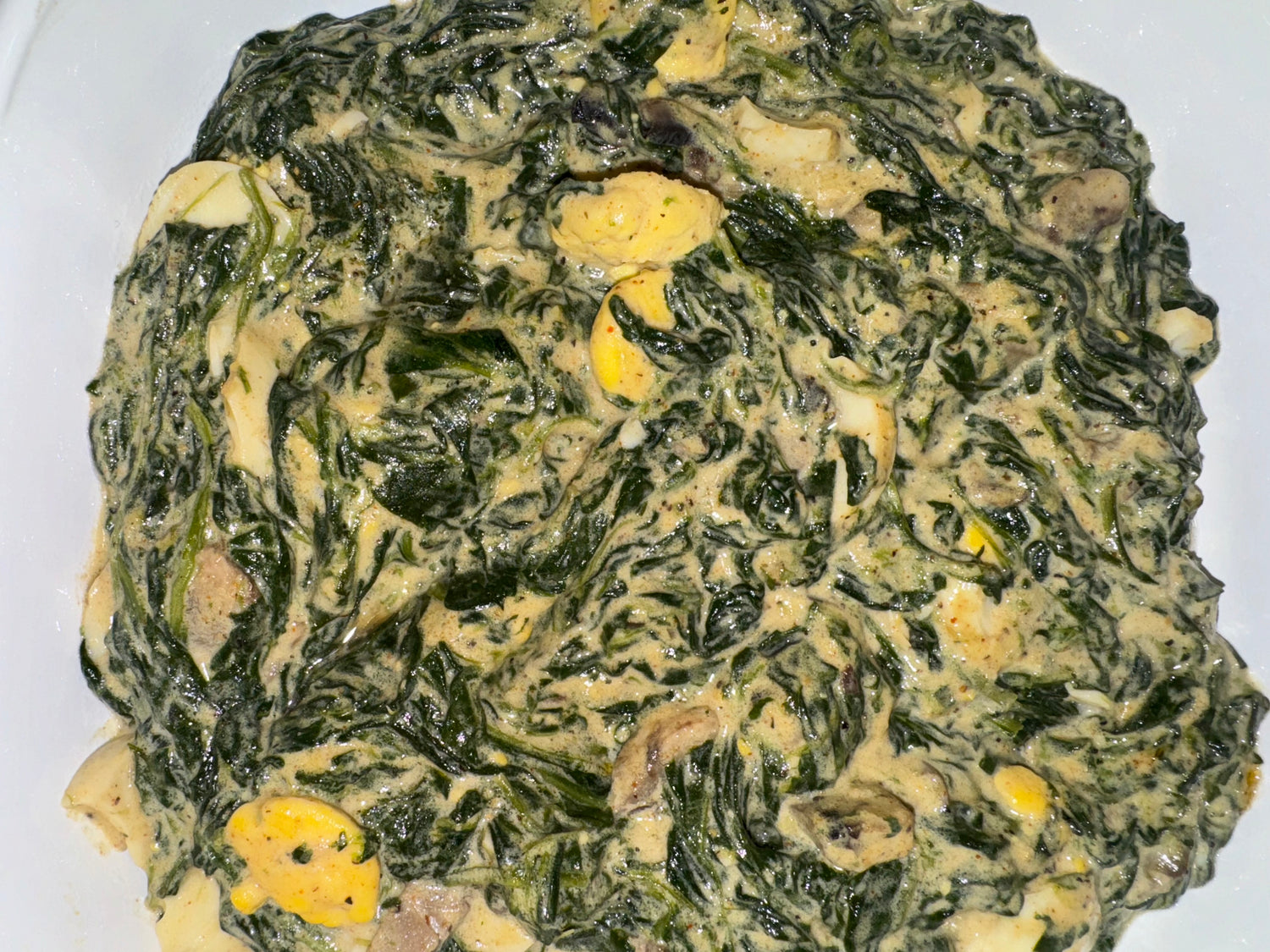 - 4-5 tablespoons butter - 1 can light beer -4 bags of baby spinach - 4-5 eggs, hard-boiled - 1 can Campbell’s cream of mushroom soup - Optional: Fresh sliced mushrooms - 2 tablespoons Mouton’s All-Purpose Seasoning - 4 tablespoons mayonnaise