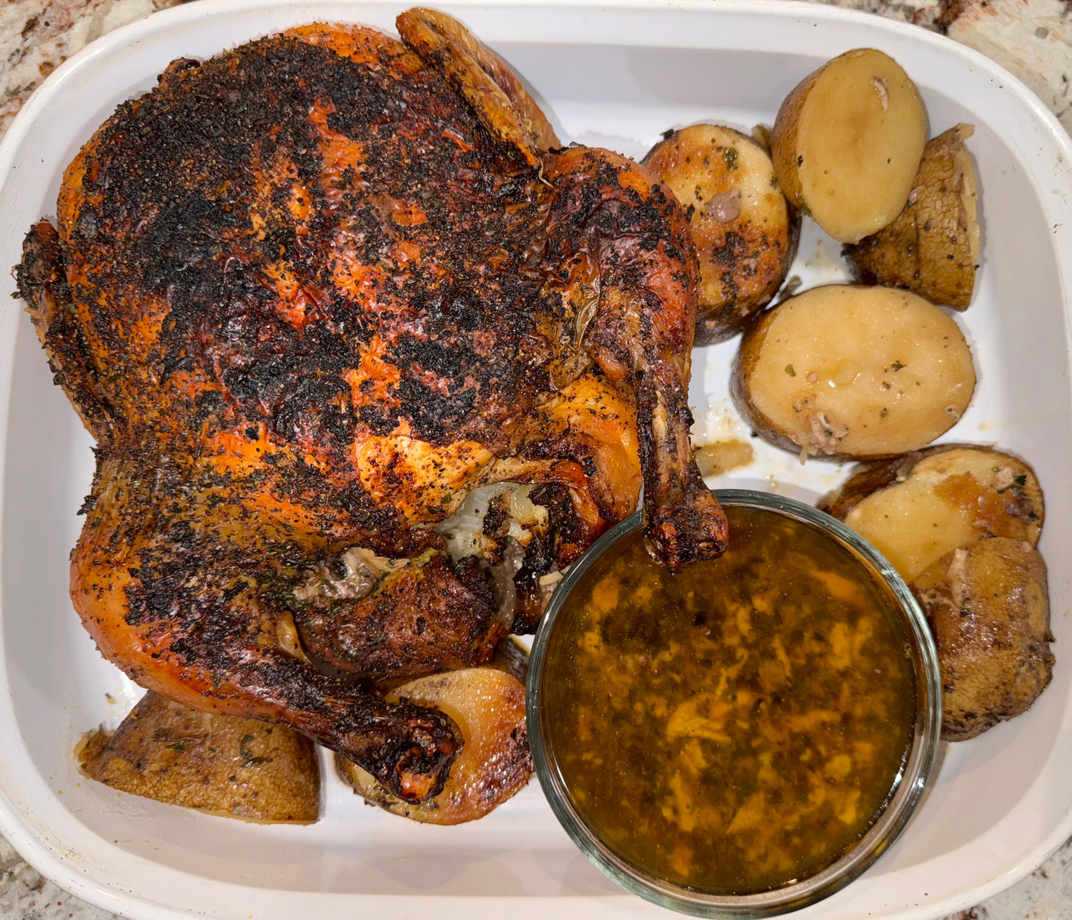 - 1 whole chicken (about 5 pounds) - 2-3 large potatoes - 2 tablespoons olive oil - 1 tablespoon salt and pepper - 1½ cups hot water - 3 heaping tablespoons Mouton’s All Purpose Seasoning - ½ yellow onion - 5 cloves garlic