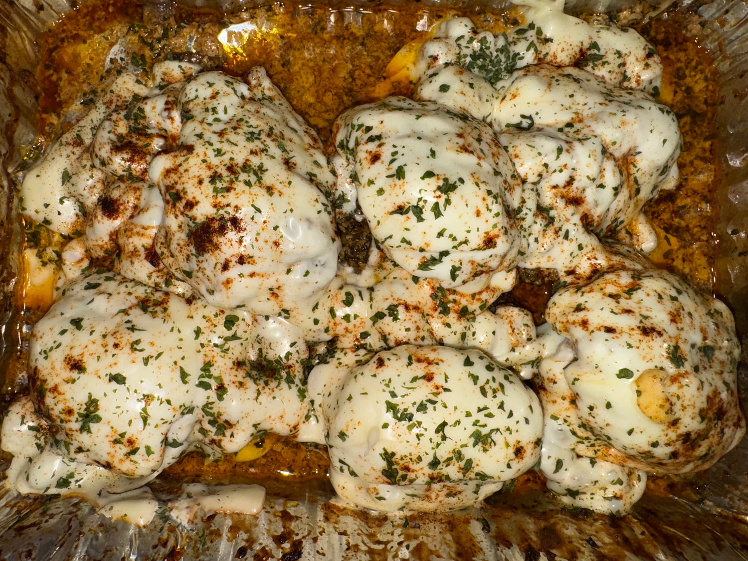 - 6 large chicken breasts - 1 pound 31-40 count shrimp, peeled - ½ container of sliced white mushrooms - 7 tablespoons minced garlic - 13 tablespoons Mouton’s All-Purpose Seasoning - 7-8 tablespoons parsley flakes - 7 tablespoons mayonnaise - Paprika (for garnish) - 6-10 slices of Swiss cheese