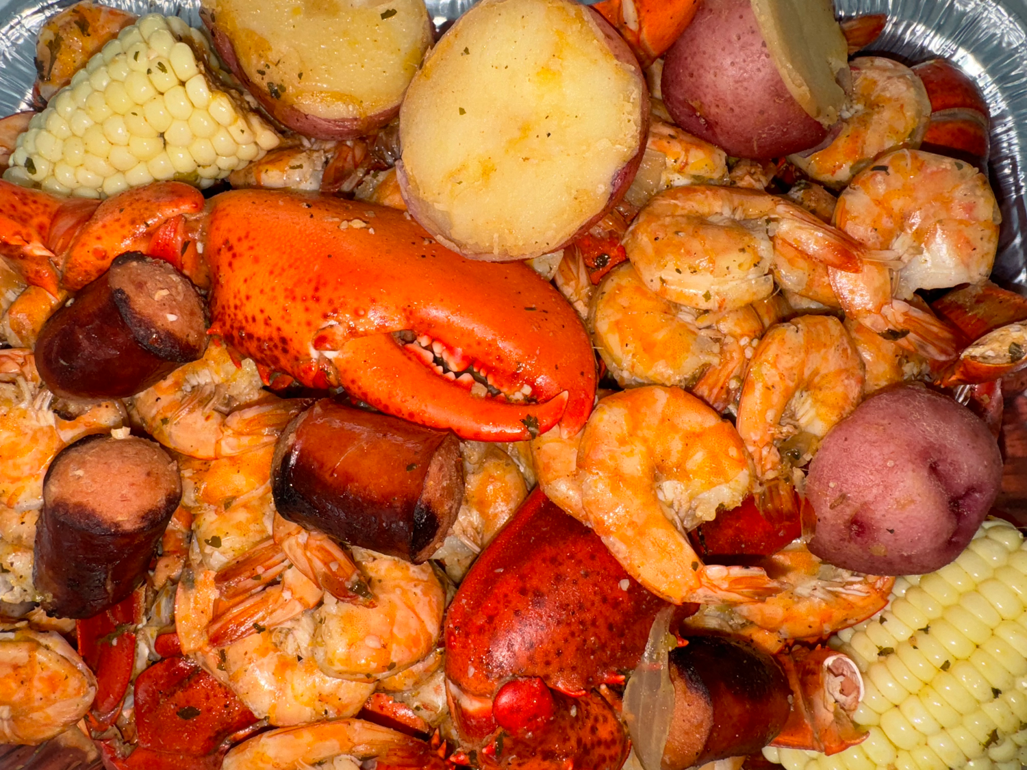- 3 onions, quartered - 3 bell peppers, quartered - 2 boil-in bags of crawfish, shrimp, and crab boil - 1 bag of crawfish, shrimp, and crab boil seasoning - 6 lemons, halved - 1 cup minced garlic - Accent seasoning, to taste - Lawry’s seasoning salt, to taste (start with ½ cup) - Mouton’s All-Purpose Seasoning, to taste - 4 sticks of butter - 8 pounds of shrimp - 8-12 Louisiana sausages - 3 pounds of red potatoes - 6 ears of fresh corn, cut in half