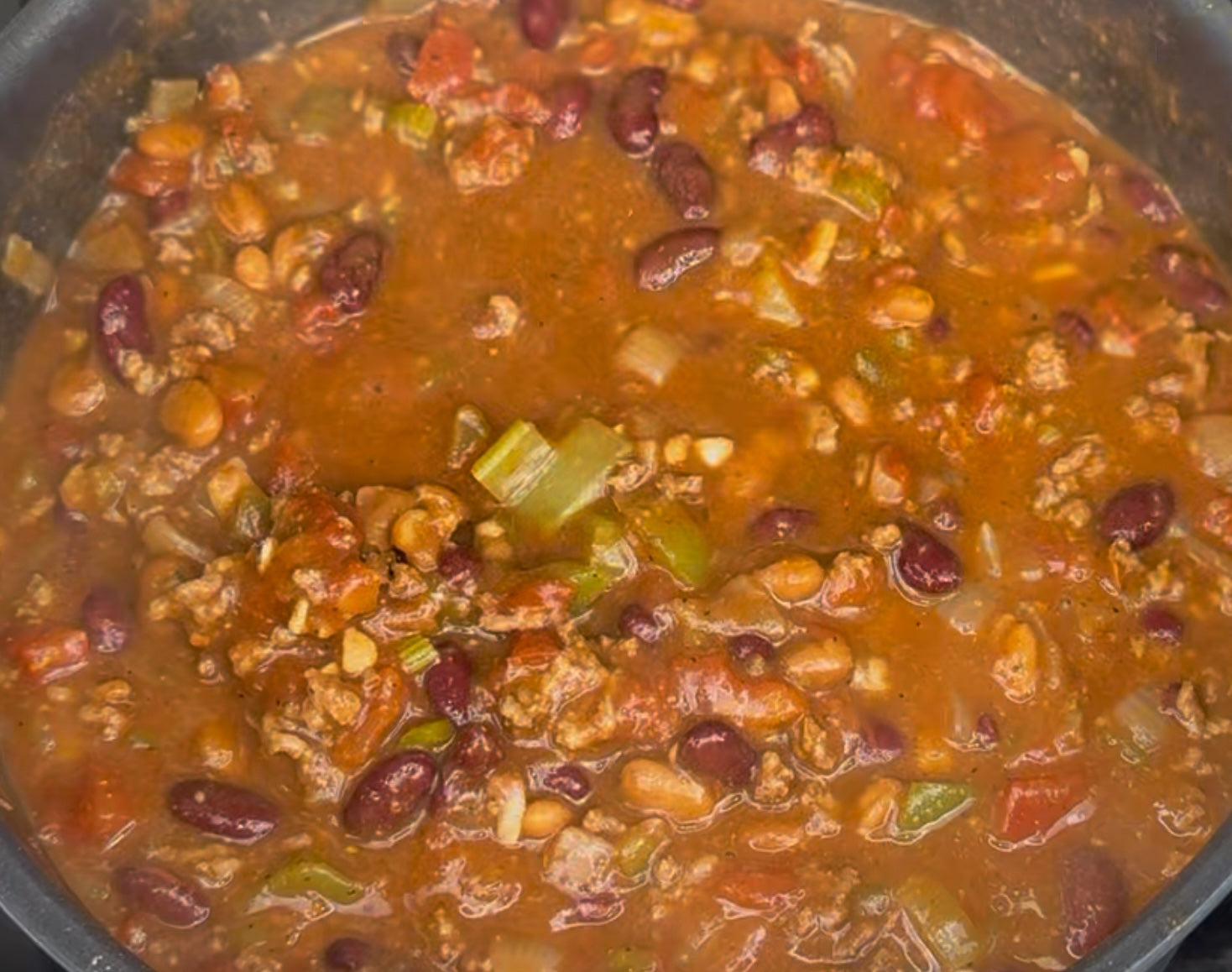 -1 pound ground beef - 1 green bell pepper, chopped - 1 yellow onion, chopped - 2 stalks celery, chopped - 2 cans diced tomatoes (14.5 oz each) - 1 can tomato paste (6 oz) - 1 cup beef broth - 1 jalapeño, chopped - 2 cans kidney beans - 2 cans chili-seasoned pinto beans - 4-5 cloves garlic, minced - Mouton’s All-Purpose Seasoning, to taste - Chili powder, to taste - Oregano, to taste - Cumin, to taste - Salt and pepper, to taste - Seasoned salt, to taste - Garlic powder, to taste - Red Rooster Louisiana Hot Sauce, to taste - 1-2 tablespoons olive oil