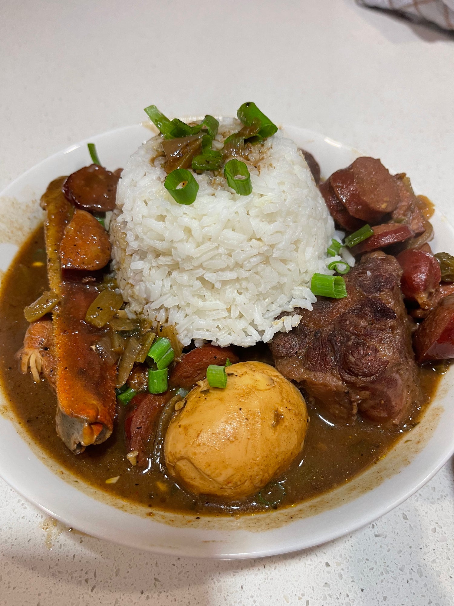 - Roux - 2 white onions - 2 green bell peppers - 4 stalks of celery - 8 fresh cloves of garlic - 1 stalk green onions - 2 boxes of chicken stock - Approximately 16 cups of chicken broth - 2 chicken breasts - Crystal hot sauce, to taste - 5 chicken legs - 4 fresh andouille sausages - 2 packages of Louisiana sausage - 10 Eggs - 1-2 pounds of crab legs - Gumbo file, to taste - Mouton's All Purpose Seasoning, to taste